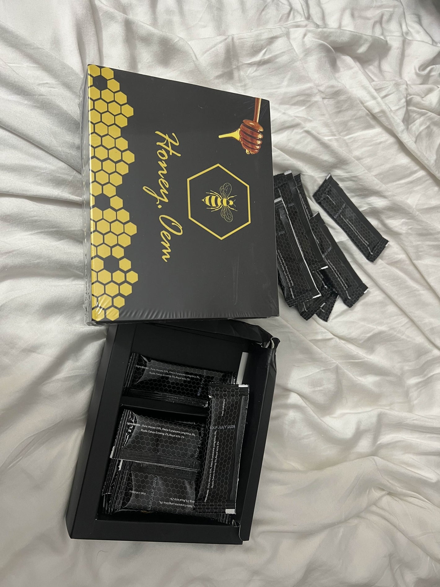 Each satchet contains : 93% Pure Honey, Radix Eurycoma Longifolia 3% (also known as Tongkat Ali), Radix Panax Ginseng 2%, and 2% Royal Jelly.